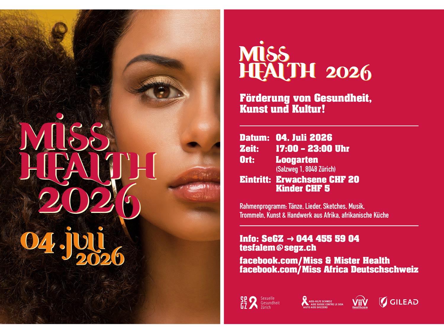 Bei Miss Health geht es neben Schönheit um wichtige Themen der Gesundheit. Geniessen sie einen Abend mit Musik, Showeinlagen und nutzten sie die Möglichkeit sich kostenlos und anonym auf HIV, Hepatitis B und Hepatitis C testen zu lassen.